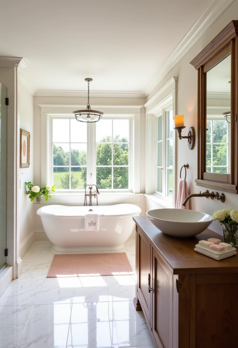 Decorative elements such as fresh flowers and elegant soap dishes complete the inviting atmosphere, making this bathroom a delightful space for relaxation and self-care. This design is perfect for those who appreciate the beauty of natural light and floral aesthetics.