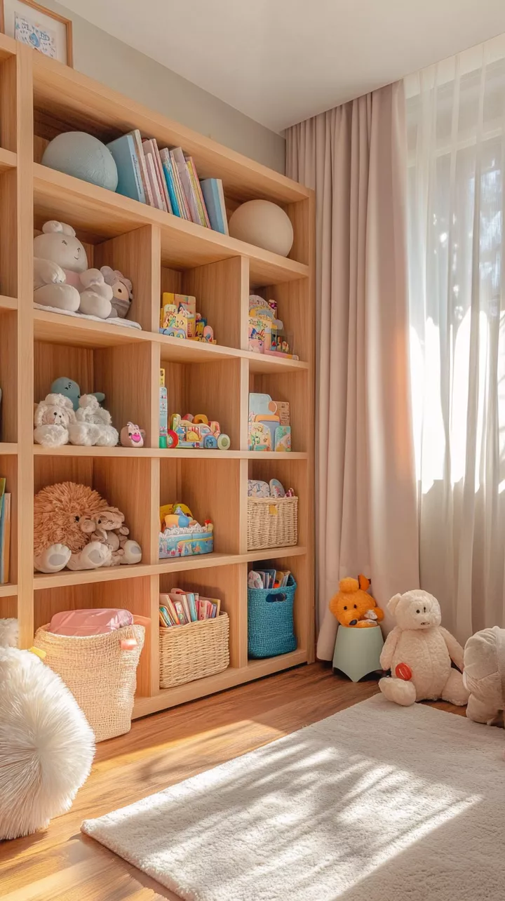 - Organizing Tip: Use neutral-toned woven baskets on the lower shelves to hide clutter while maintaining easy access to toys and essentials.