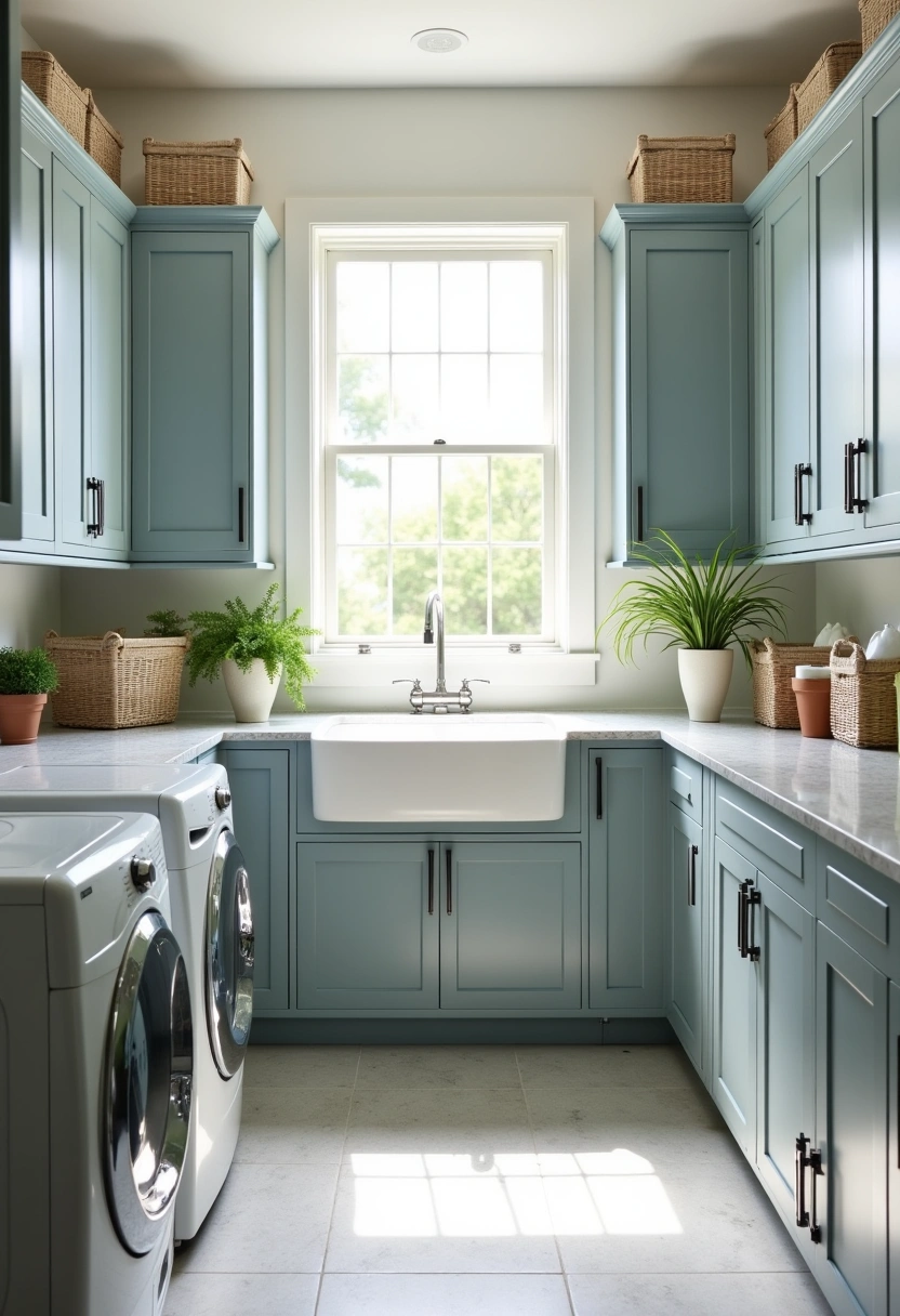 Decorative baskets hold laundry essentials while potted plants add a touch of life to the space. Bright, natural light floods in through a large window, illuminating the whitewashed walls and enhancing the calming palette of gentle blues and whites.