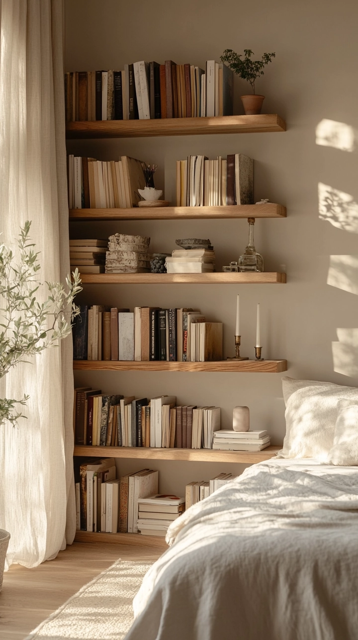 If you love a clutter-free, peaceful bedroom, floating wooden shelves are the way to go. Mounted above the bed, these shelves create a sleek and functional design. Use warm, earthy-toned books and minimal decor like candles and small potted plants to maintain a calming ambiance.