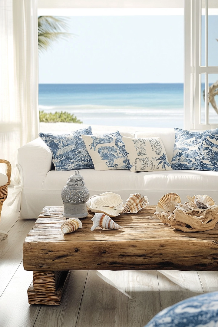 Coastal calm meets modern elegance in this seaside living room retreat. A crisp white sofa with blue and green throw pillows anchors the room, while a low wooden coffee table adds warmth. Nautical-themed decor like starfish sculptures and marine art are strategically placed for subtle seaside flair.