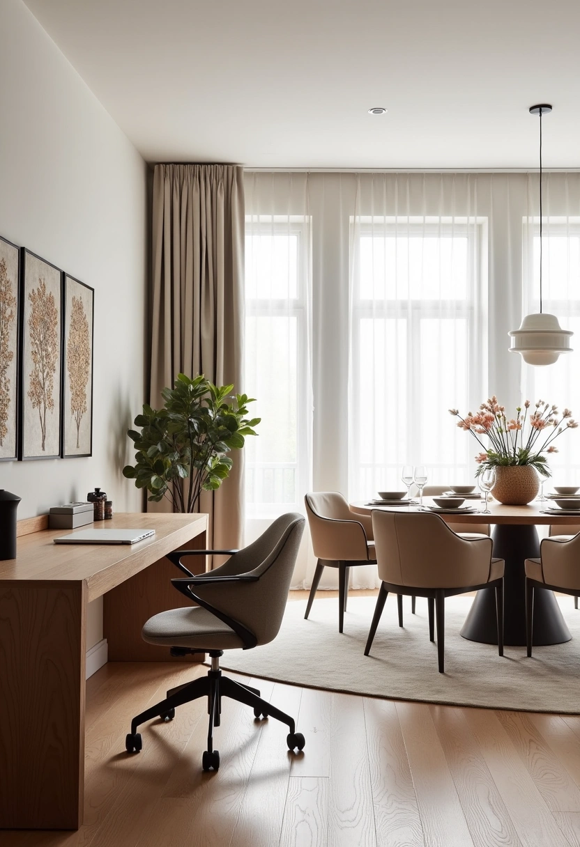 Enter a sleek minimalist dining room office combo that emphasizes clean lines and open space. The design features a simple wooden dining table and a minimalist desk with a single statement chair.
