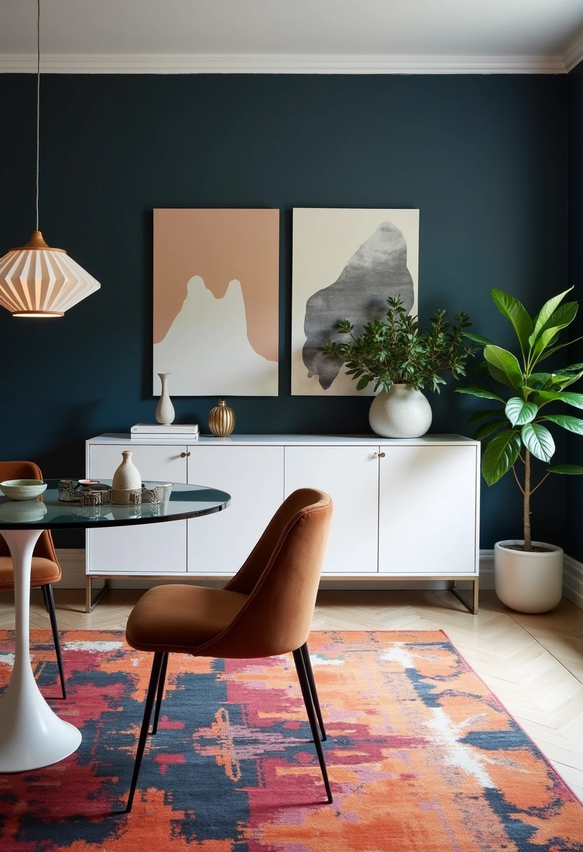 Imagine a dining room where the walls are painted in a deep navy, creating a striking backdrop for a sleek, white lacquered sideboard. This contemporary design concept embraces clean lines and bold contrasts, with geometric art pieces hanging above the sideboard, adding a touch of modern flair.
