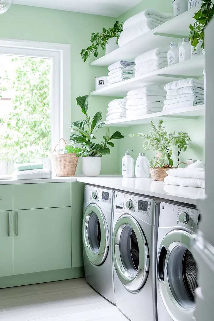 - Green Baskets and Bins: Perfect for organizing laundry supplies and adding a pop of green color.