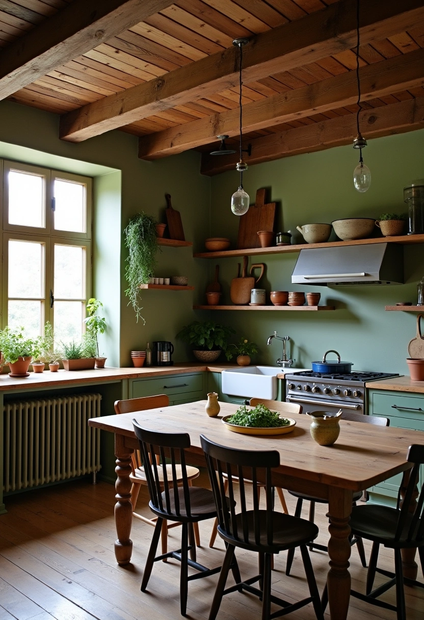 Potted herbs line the windowsill while vintage kitchenware is lovingly displayed on open shelves, contributing to the room’s homely feel. Warm, ambient lighting casts a glow that further enhances the earthy tones of greens and browns, creating a relaxed and welcoming atmosphere.