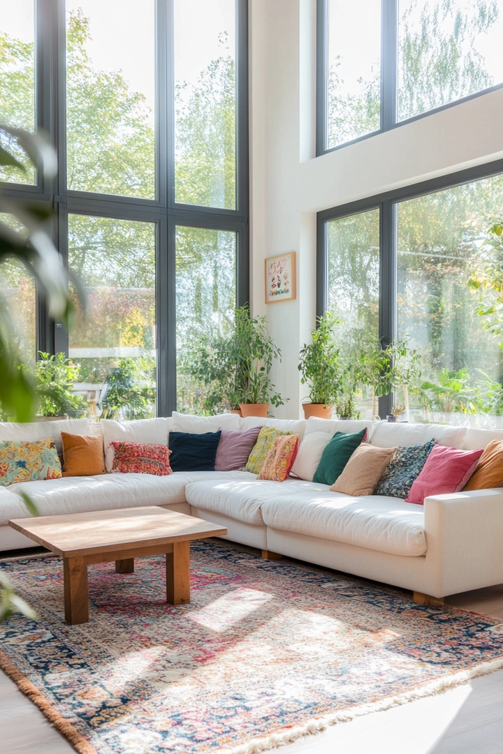 - A large, colorful sofa filled with pillows in different patterns and hues becomes the centerpiece.
