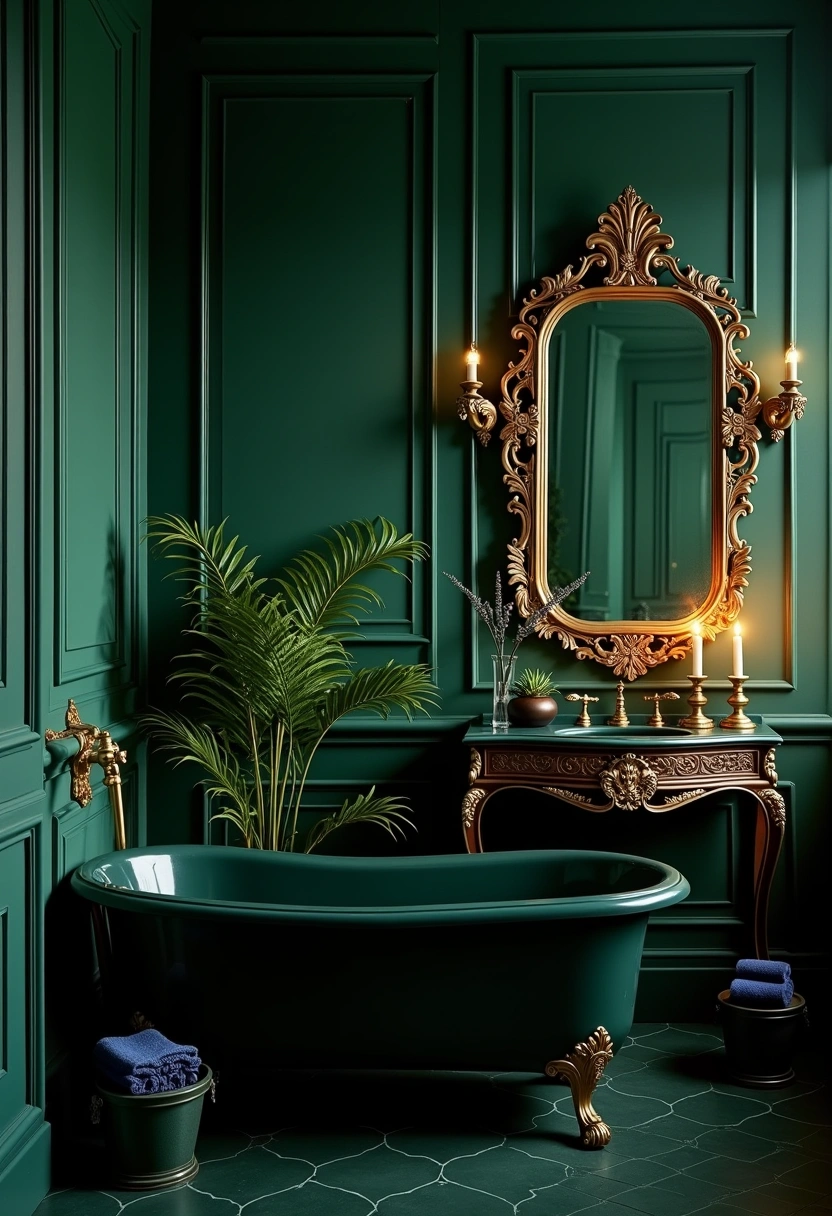 This design concept is ideal for those who appreciate dramatic aesthetics and want to make a statement in their bathroom. The combination of rich colors and luxurious elements creates a personal sanctuary that invites indulgence.
