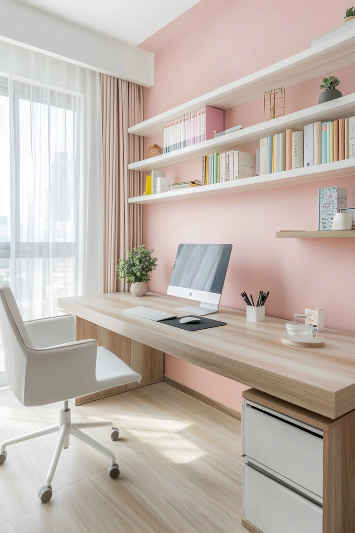 If you love cheerful, bright spaces, this Sunny Pastel Office Oasis is a dream come true. The soft pastel walls in shades of light pink and cream create a warm, inviting vibe. The room is flooded with natural light, which enhances the soft tones and makes the environment feel uplifting.