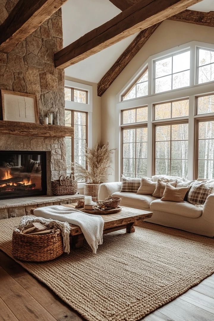 Create a living room that offers both rustic charm and modern relaxation. The key is to mix warm, natural elements with plush furniture.