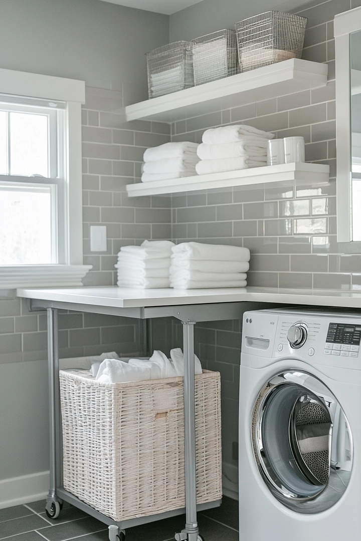 • Open Shelves: Display laundry essentials and decorative baskets, adding both functionality and style.