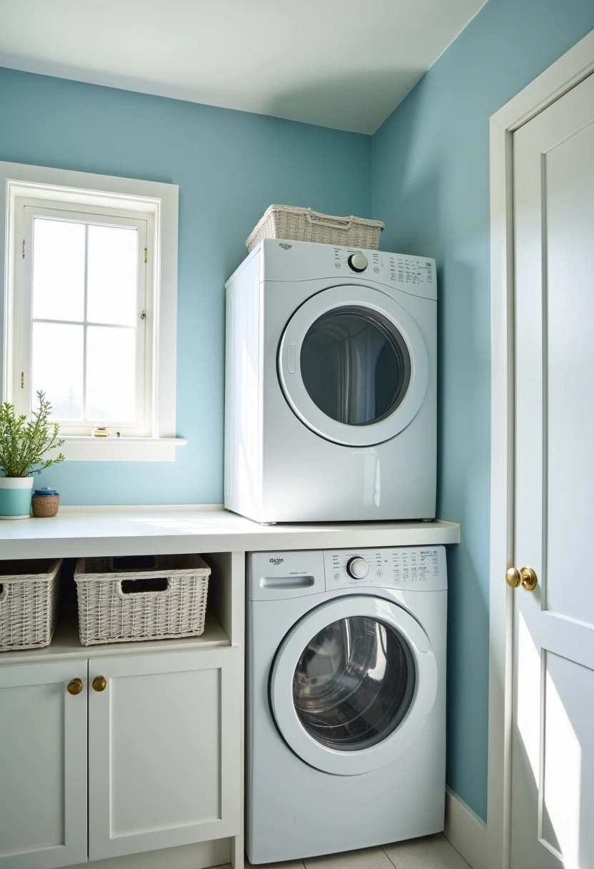 A modern laundry room featuring a stackable washer and dryer set against a backdrop of soft blue walls creates a serene and inviting atmosphere. The sleek, white countertop for folding clothes is not only practical but also enhances the overall aesthetic.