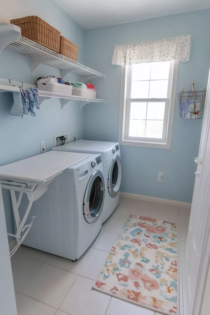 A white laundry room can make a small space feel bright and spacious. This design features white shelves combined with light blue walls, creating a cheerful and airy ambiance.